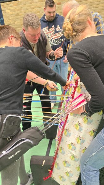Geschossen wurde dann auf eine Scheibe – auf kleine nummerierte Ziele, jeweils mit einer Ein-Pfeil-Runde. Thorsten hatte die Zielscheibe mitgebracht: Diese war mit Geschenkpapier umwickelt – mit dem Motiv Disney-Prinzessinnen. Zudem zierte noch eine rote Glitzergirlande die Scheibe. Der unruhige Hintergrund machte das Schießen noch spannender.